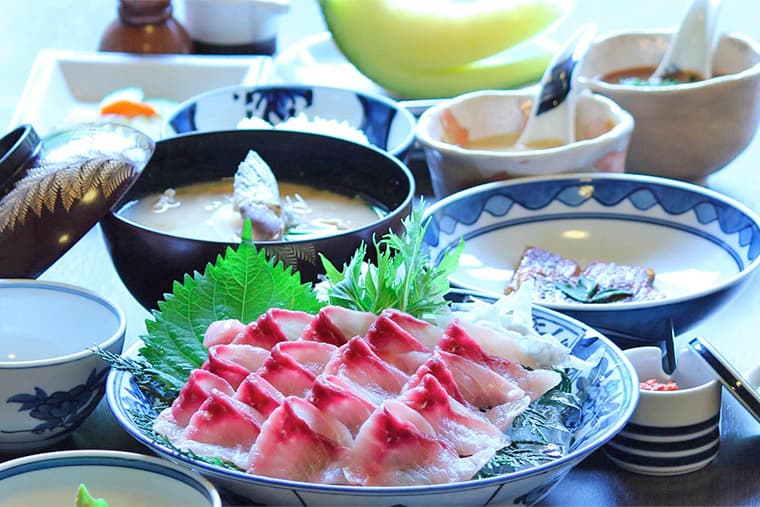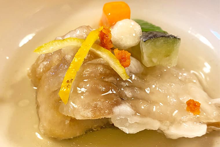 You can't visit Ryusuitei without trying "koi-no-arai” (鯉のあらい), it's raw fish but a little different to traditional sashimi. The name 'koi no arai' translates to 'washed carp.' The dish is prepared by washing the pieces of fish in warm water at a ratio of 1:10 (one part fish, 10 parts water). As the temperature of the warm water drops, more warm water is added. After, the flesh will have tightened and become firm, after the fish is then washed with cold running water and drained. It’s served cold, making it an ideal hot weather dish, and it is incredibly popular in summer.