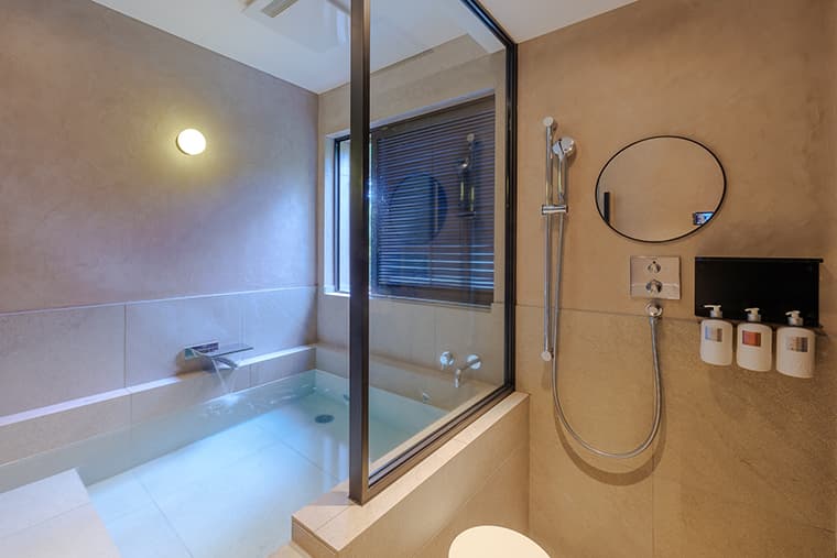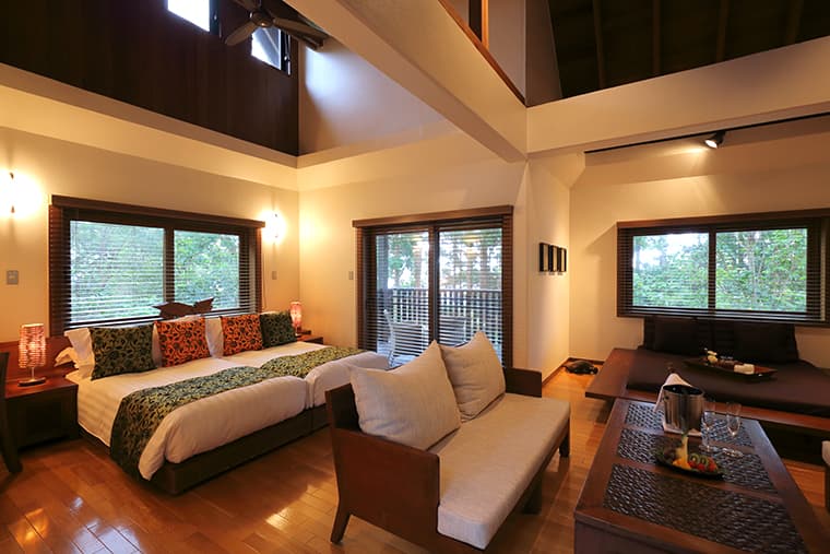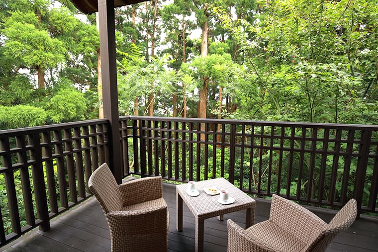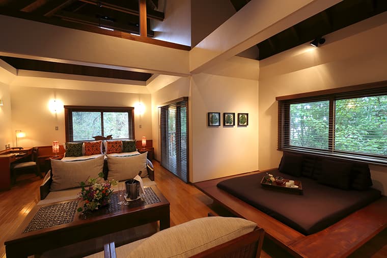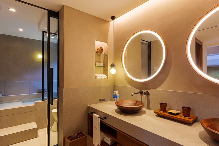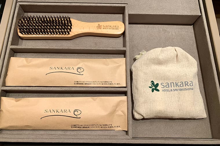 The interior of each room is artfully curated. Each type of villas and suites has its own spacious spa bath, and bathroom amenities are made from natural materials, with wooden hairbrushes and biodegradable toothbrushes available for use. The lotions and beauty products use ingredients derived from Yakushima's own flora and water. There are also woven basket bags that you can use during your stay.