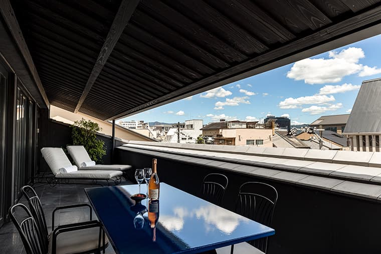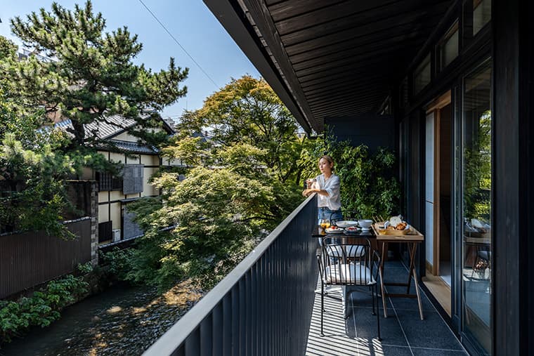 Each of the nine bright, spacious, and artfully designed suites boasts its own unique attributes while retaining a sense of unity throughout, pops of color set off the minimalist Japanese design flourishes with a sense of playfulness, and each room is well-stocked with amenities to make your stay all that little more fun. With large, cypress-scented bathtubs, sleek marble counters made from monoliths, and fresh, velvety tatami mats, the design of the interiors connect guests to the organic world embracing the gifts of nature in a way that feels refined. Each room also boasts a view of Gion Shirakawa from the balcony, a tidy little design flourish that embraces the beauty of the city and doesn't go unnoticed.