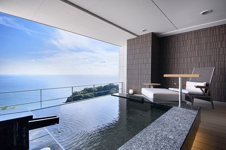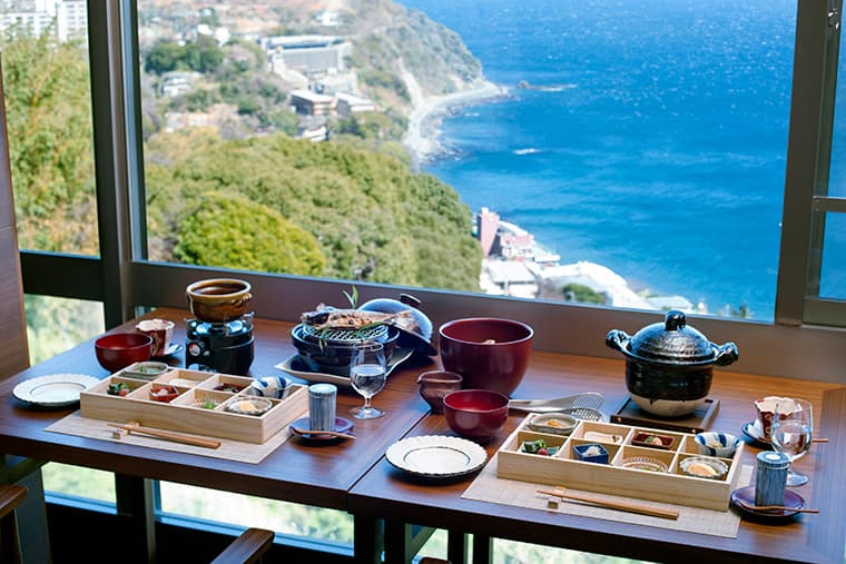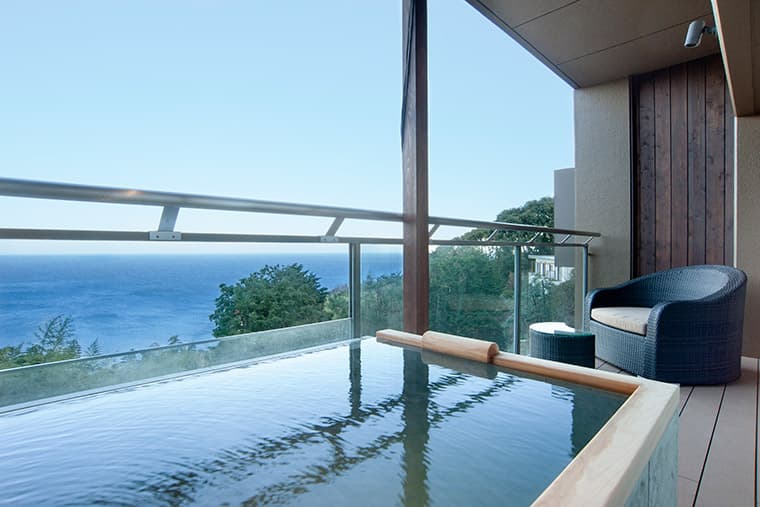 The facilities and rooms are all comfortable and quiet, and boast top-of-the-line fittings and amenities; all rooms also have rotemburo open-air baths that look out onto lovely, restful views over Sagami Bay and the town of Atami.
