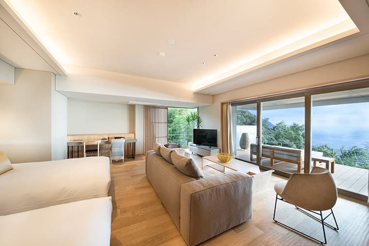These rooms have beds in a choice of twin or double, upon request. They also have spacious verandas, with ocean or garden views, as well as an inviting rotemburo open-air bath with a comfortable sitting area.