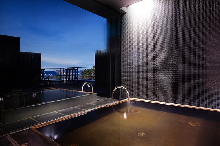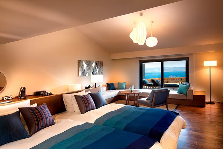 Slip through a covered cobblestone walkway into the luxurious world of your private suite, where picture windows and clean lines enhance the warm light of the Seto Inland Sea and the soothing whites and blues of the modern decor mirror the natural coastal beauty just beyond your expansive sun terrace. An Ohtani-yaki soaking tub big enough for two, rain shower, and sheltered interior deck offer a peaceful oasis for more private relaxation. Silky soft tatami mats, lush Imabari linens and plump sofa perches provide a subtle texture of refinement accented by dark wood shoji screens and the warm light of washi paper lamps, cocooning you in the sublime simplicity of Japanese design.