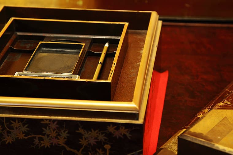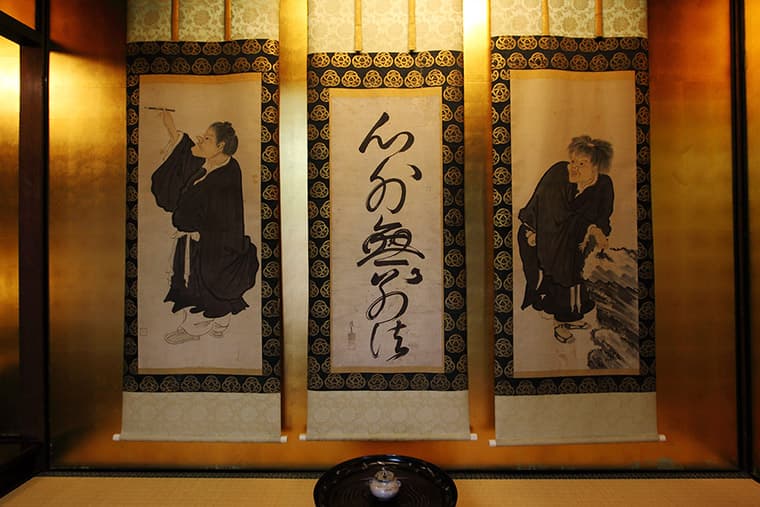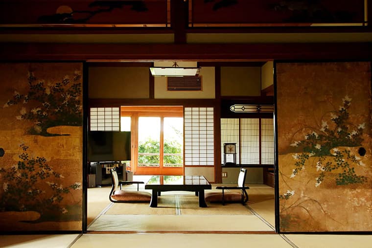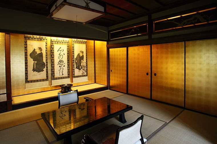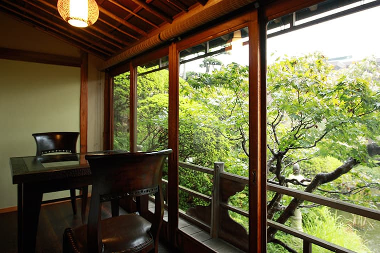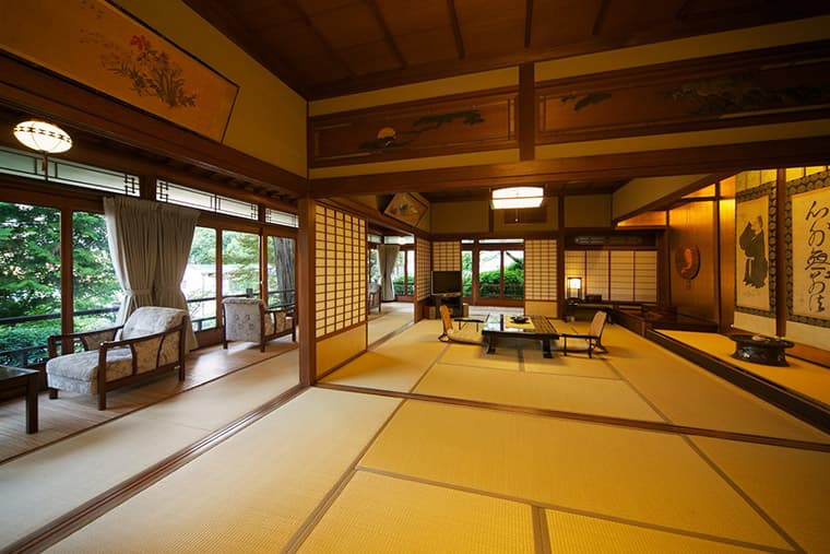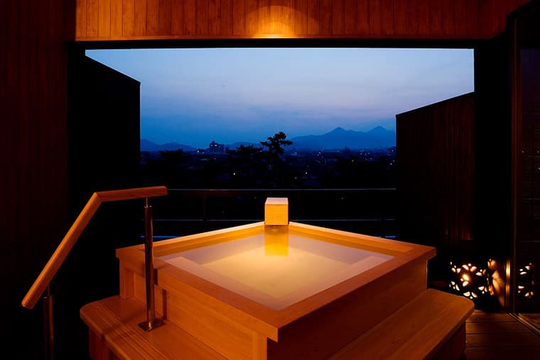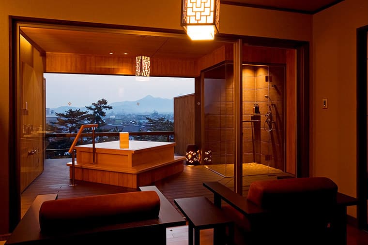 This beautiful suite features a big 18-mat tatami room and an entire wall of windows overlooking the town, and tile-roofed villas. Inside, the rooms are like a step back in time to the Taisho era and before, including period paintings on the fusuma sliding doors, hanging scrolls, and traditional household items like shodo (calligraphy) and chado (tea ceremony) boxes. The bath is equally spacious and sports a carved wood roof.