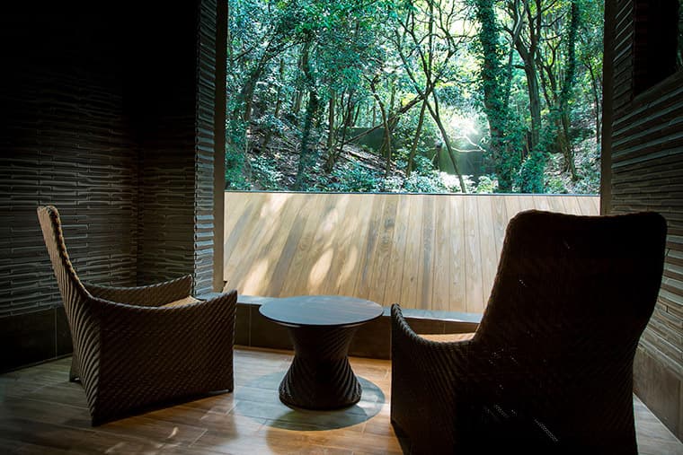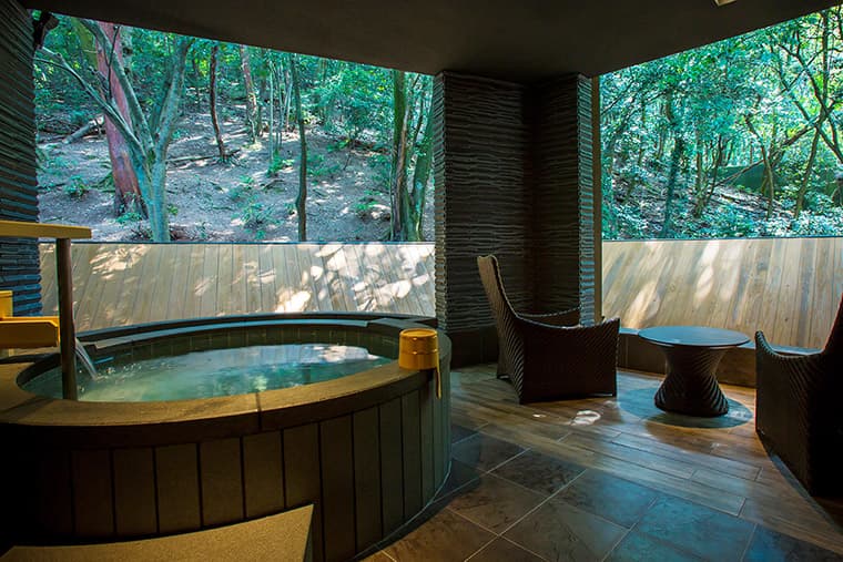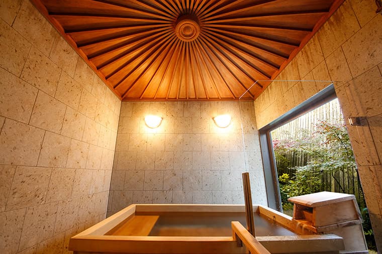 The private rotemburo, "Nagomi-yu," boasts a big wooden tub with a spectacular view over the valley. Another private rotemburo "Morino-yu" is an open-air bath with a granite bath, where you can enjoy the hot spring while feeling a sense of unity with nature surrounded by tree. These baths can be reserved for families and small parties.