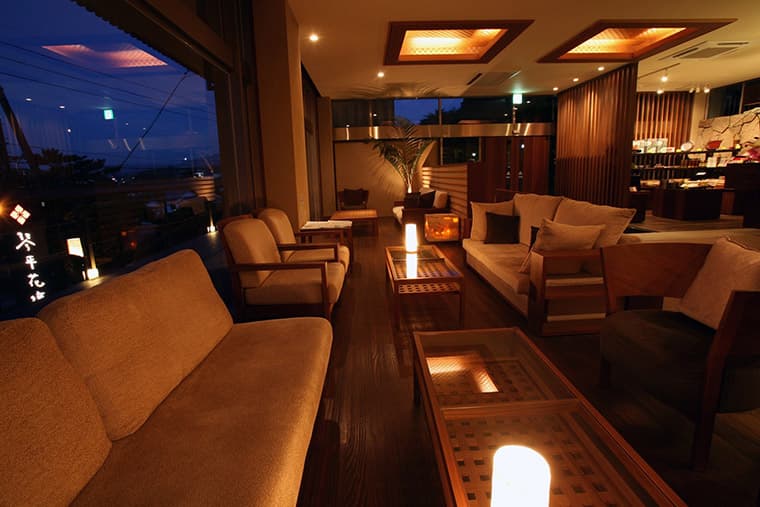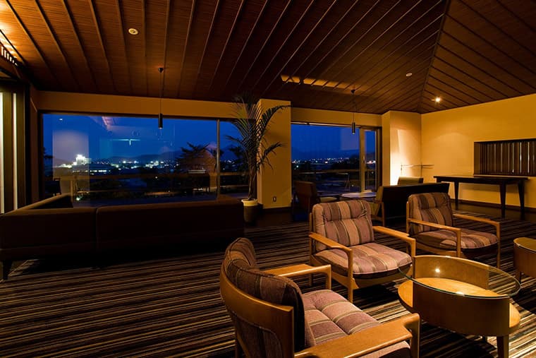 This public space includes a library, a bar, pleasant jazz music, massage chairs, and wireless internet access and computers for the use of guests. A tsukimidai moon-viewing veranda overlooks the lights of the town and distant mountains - a very pleasant place to spend a few idle hours.